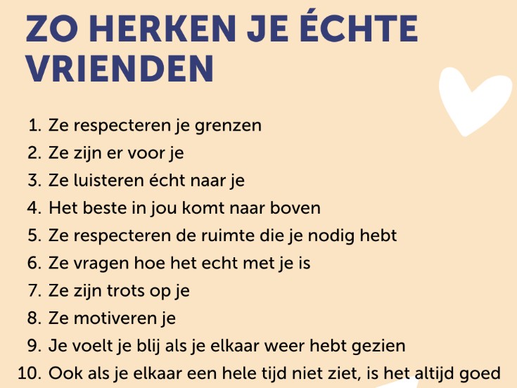 Echte vriendschap is dus geen constante feeststemming of een oneindige ‘feel good’-film. Het is soms rauw, soms stil, soms chaotisch. Maar altijd echt. En als je met iemand kunt lachen én huilen, en zelfs ruzie kunt maken zonder elkaar kwijt te raken… dan heb je goud in handen.