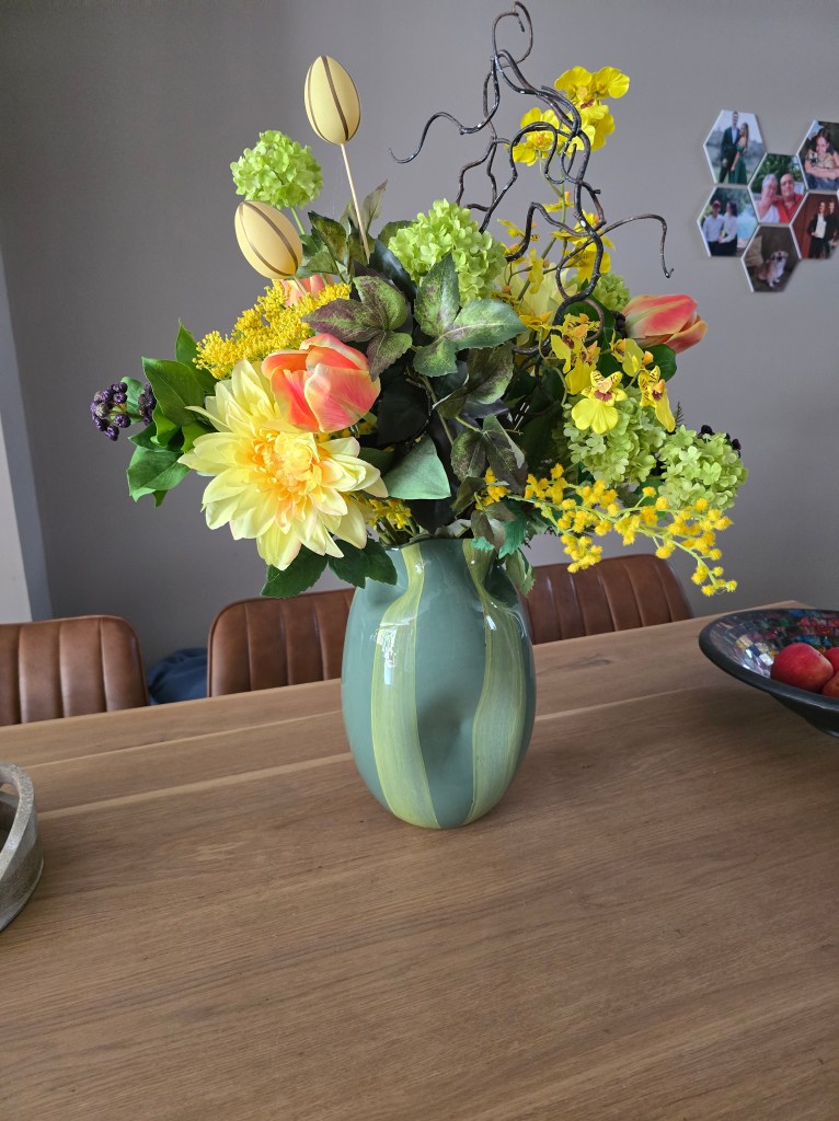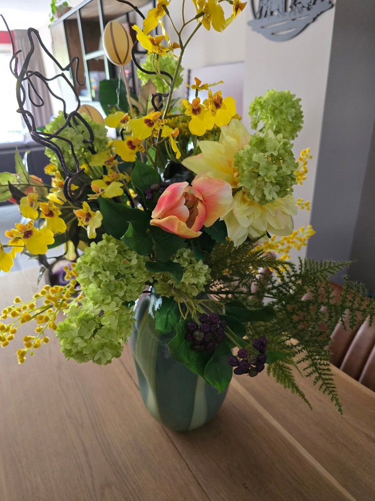 Ik heb een vrolijk paasboeket aangeschaft dat na Pasen gewoon een tweede carrière krijgt als lenteboeket. Even een kleine shuffle en voilà… nieuw seizoen, zelfde bloemen, nul drama.
